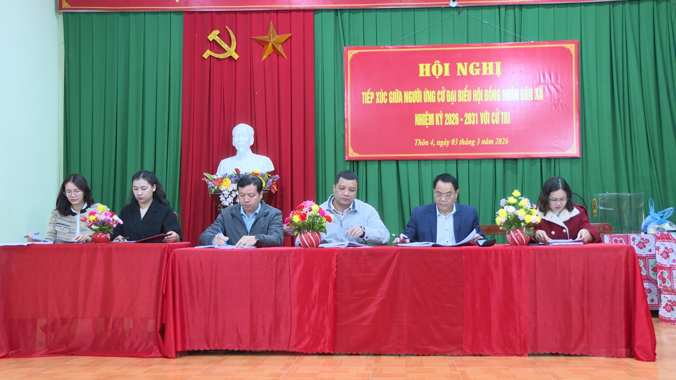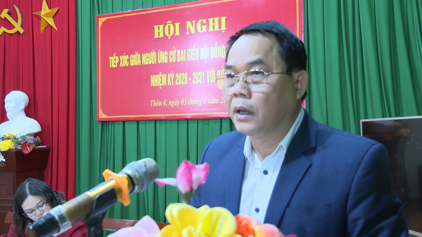Thay mặt các ứng cử viên, ông Sầm Anh Dũng, Phó Chủ tịch HĐND xã trân trọng cảm ơn và nghiêm túc tiếp thu các ý kiến của cử tri thôn 4. Đồng thời khẳng định nếu được cử tri tín nhiệm bầu làm đại biểu HĐND xã, sẽ cùng tập thể HĐND xã phát huy vai trò giám sát, theo dõi đến cùng việc giải quyết các kiến nghị chính đáng của Nhân dân; kịp thời kiến nghị cơ quan có thẩm quyền đối với những nội dung cần phối hợp xử lý. Qua đó, góp phần nâng cao hiệu lực, hiệu quả hoạt động của chính quyền cơ sở, củng cố niềm tin của Nhân dân đối với cấp ủy, chính quyền địa phương./.