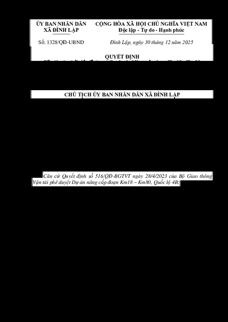| File đính kèm | QUYẾT ĐỊNH Về việc thu hồi đất để xây dựng công trình giao thông Dự án Nâng cấp đoạn Km18 - Km80 Quốc lộ 4B, tỉnh Lạng Sơn Chu Văn Nguyệt | ||