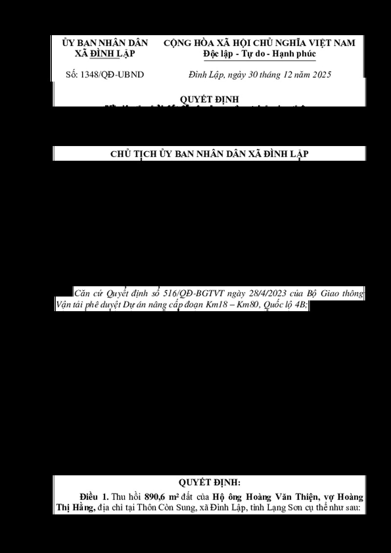 | Tiêu đề văn bản | QUYẾT ĐỊNH Về việc thu hồi đất để xây dựng công trình giao thông Dự án Nâng cấp đoạn Km18 - Km80 Quốc lộ 4B, tỉnh Lạng Sơn Hoàng văn Thiện | ||