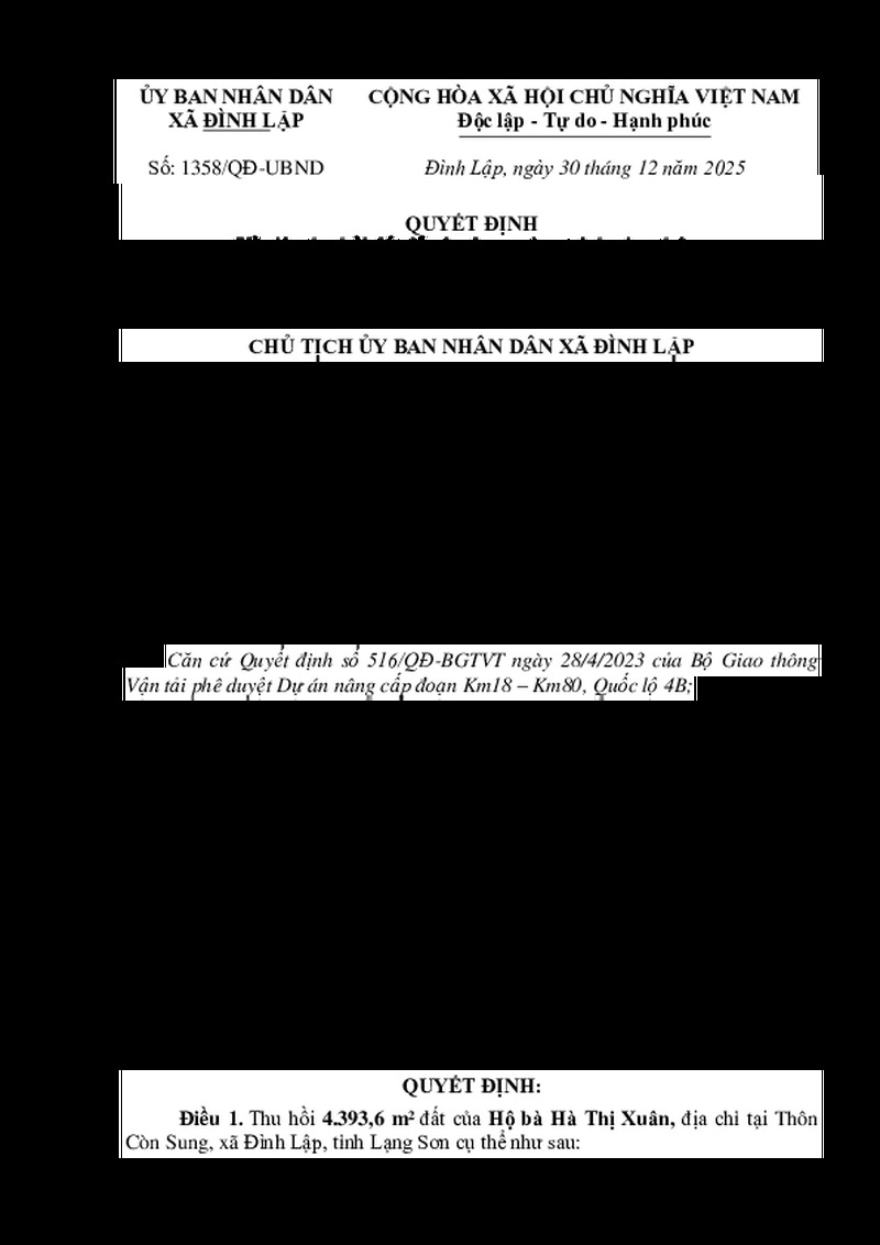 | Tiêu đề văn bản | QUYẾT ĐỊNH Về việc thu hồi đất để xây dựng công trình giao thông Dự án Nâng cấp đoạn Km18 - Km80 Quốc lộ 4B, tỉnh Lạng Sơn Hà Thị Xuân | ||
