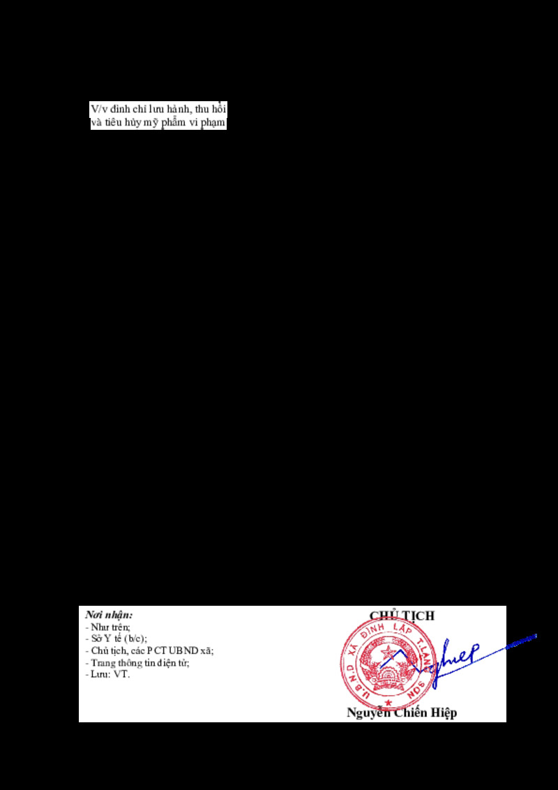 | Tiêu đề văn bản | Vv đình chỉ lưu hành, thu hồi và tiêu hủy mỹ phẩm vi phạm | ||