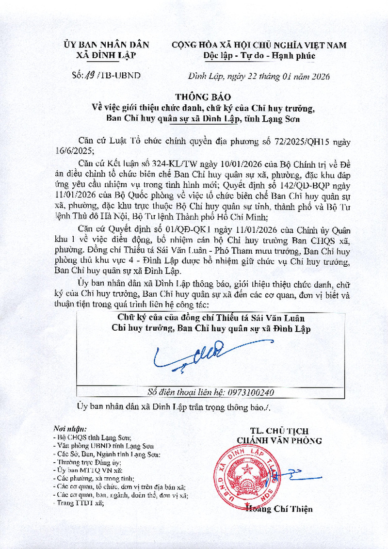 | Tiêu đề văn bản | Thông báo về việc giới thiệu chức danh, chữ ký của Chỉ huy trưởng Ban Chỉ huy quân sự xã Đình Lập, tỉnh Lạng Sơn | ||