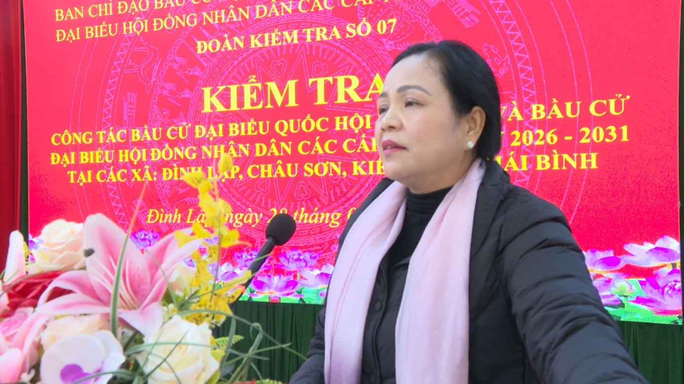 Phát biểu tại buổi kiểm tra, đồng chí Giáp Thị Bắc, Ủy viên Ban Thường vụ Tỉnh ủy, Trưởng Ban Tổ chức Tỉnh ủy ghi nhận, biểu dương tinh thần chủ động, trách nhiệm của xã Đình Lập và các xã trong công tác chuẩn bị bầu cử. Đồng chí yêu cầu thời gian tới, các xã tiếp tục bám sát các văn bản chỉ đạo, hướng dẫn của Trung ương, của tỉnh và Ban Chỉ đạo bầu cử tỉnh; thực hiện đầy đủ, đúng quy trình, đúng tiến độ các bước của công tác bầu cử theo quy định pháp luật. Đồng thời, tăng cường công tác tuyên truyền, rà soát cơ sở vật chất tại các khu vực bỏ phiếu; nâng cao trách nhiệm trong việc tiếp nhận, hướng dẫn hồ sơ người ứng cử; chủ động phối hợp với các lực lượng bảo đảm an ninh trật tự, an toàn xã hội, không để phát sinh tình huống phức tạp liên quan đến bầu cử.