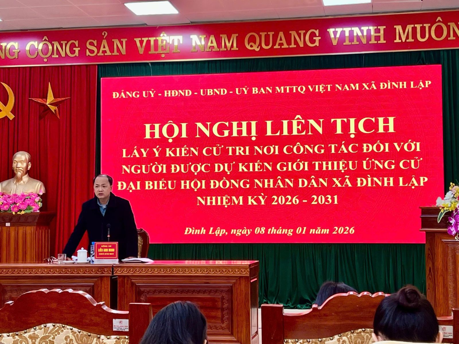 Thực hiện Luật Tổ chức chính quyền địa phương và các văn bản hướng dẫn về công tác bầu cử đại biểu Hội đồng nhân dân các cấp nhiệm kỳ 2026–2031, ngày 08/01/ 2026, Đảng ủy – HĐND – UBND – Ủy ban MTTQ Việt Nam xã Đình Lập đã tổ chức Hội nghị liên tịch lấy ý kiến của cử tri nơi công tác đối với người được dự kiến giới thiệu ứng cử đại biểu Hội đồng nhân dân xã nhiệm kỳ 2026–2031.