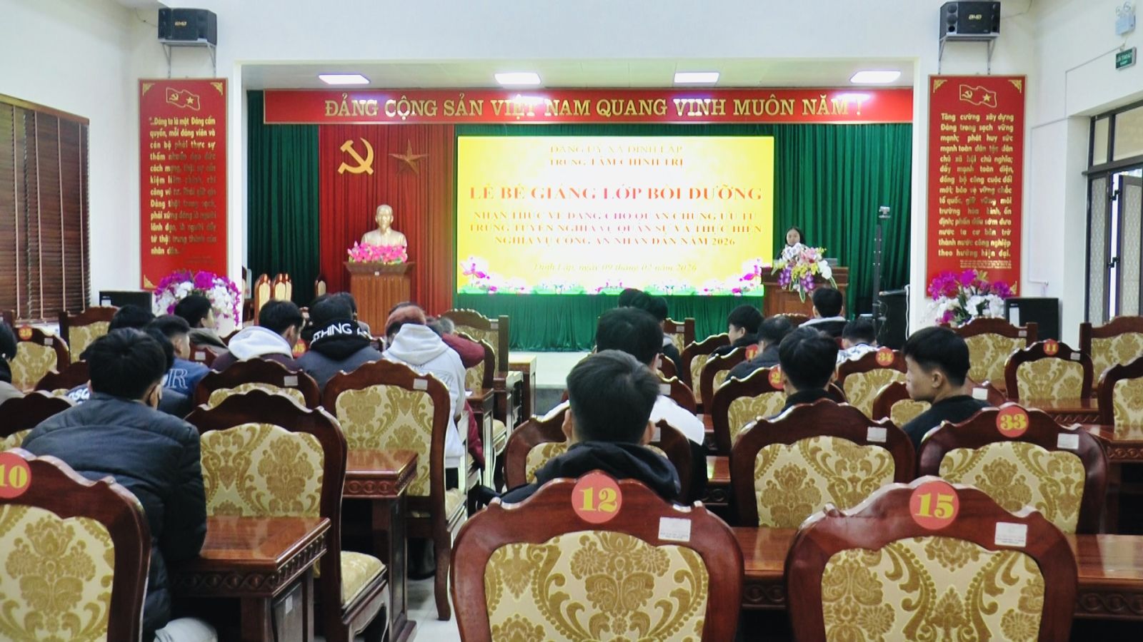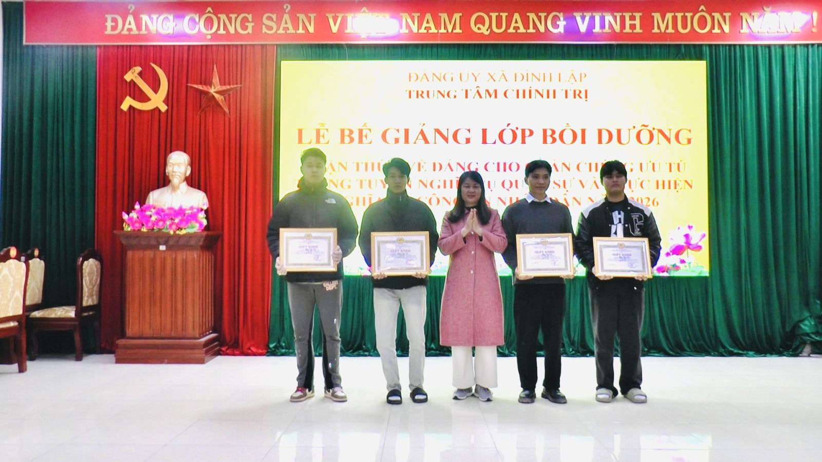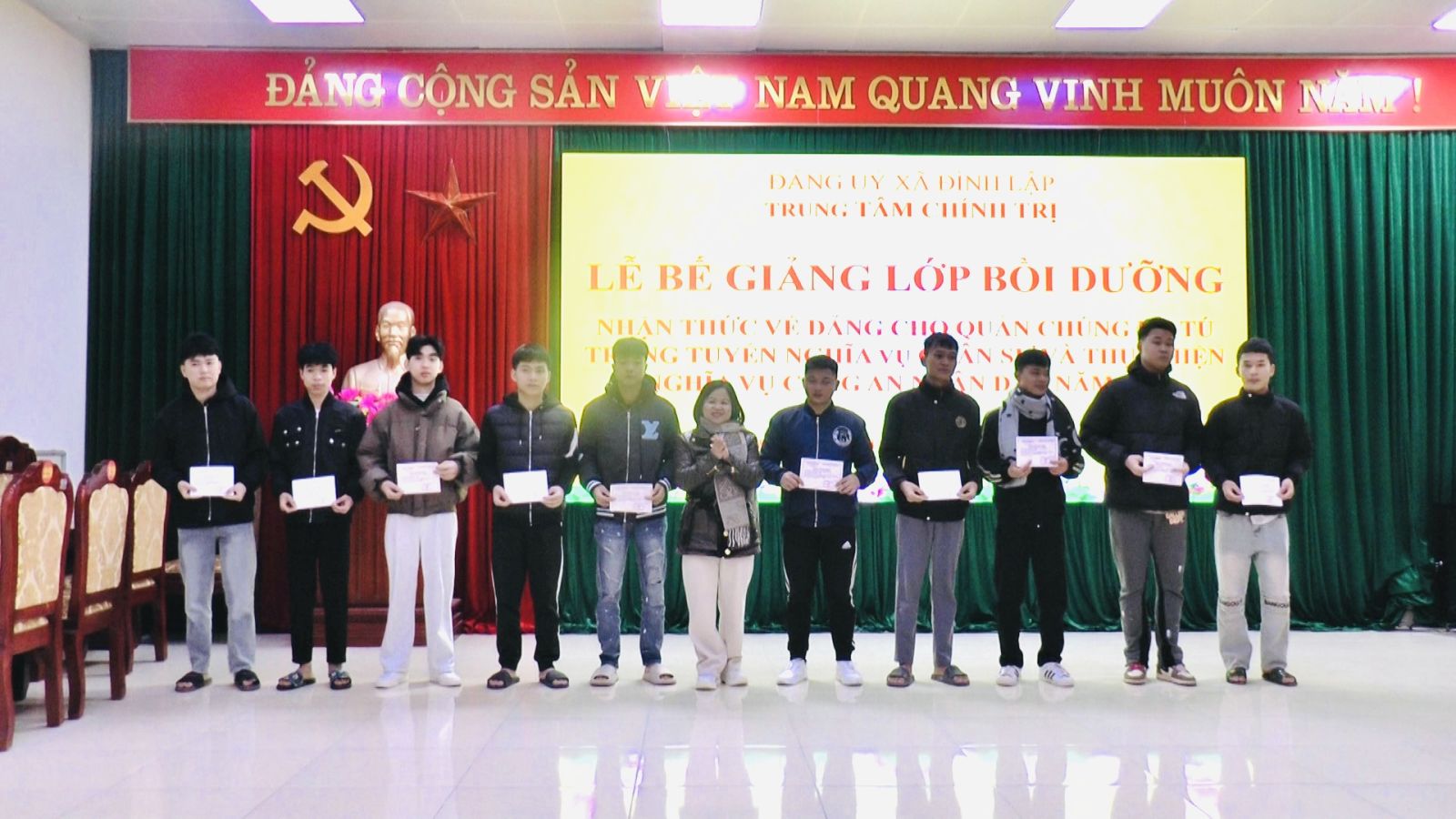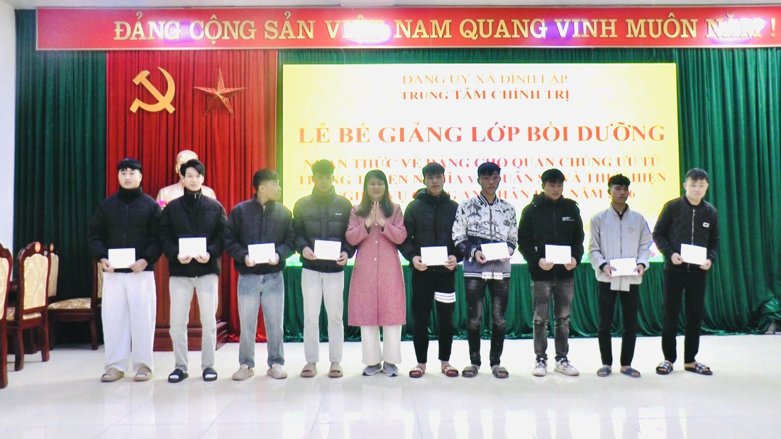 Chiều ngày 09/02/2026, Trung tâm Chính trị xã Đình Lập tổ chức bế giảng lớp Bồi dưỡng nhận thức về Đảng cho quần chúng ưu tú trúng tuyển nghĩa vụ Quân sự và thực hiện nghĩa vụ Công an nhân dân năm 2026.
