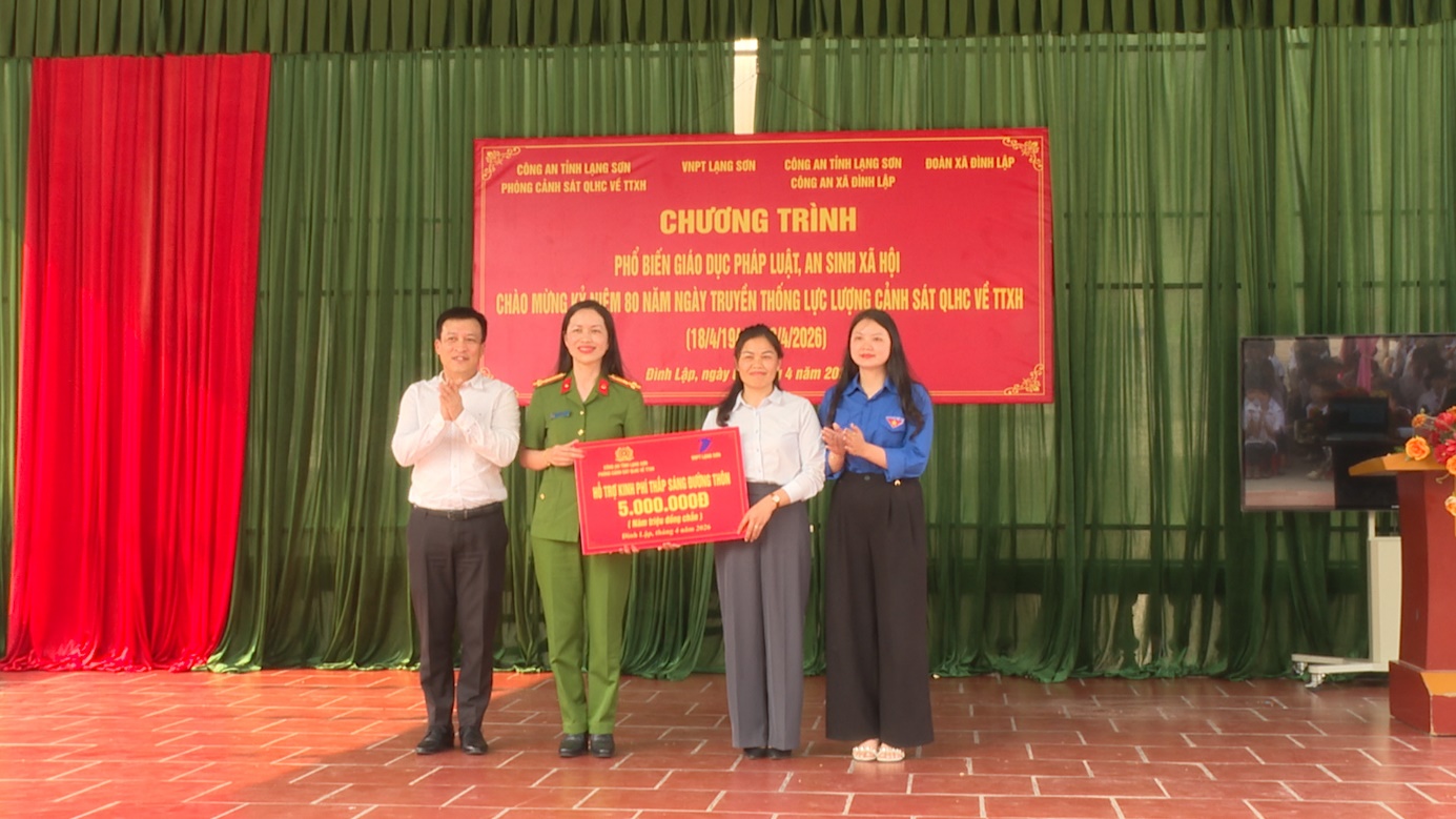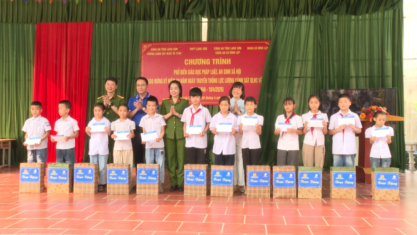 Cũng tại chương trình, Phòng Cảnh sát QLHC về TTXH – Công an tỉnh Lạng Sơn và VNPT Lạng Sơn đã trao tặng 25 suất quà cho 25 em học sinh có hoàn cảnh khó khăn của Trường Tiểu học I Đình Lập. Đồng thời, trao tặng kinh phí hỗ trợ thực hiện công trình “Thắp sáng đường thôn” cho Đoàn Thanh niên xã Đình Lập. Tổng trị giá các phần quà và kinh phí hỗ trợ trên 22 triệu đồng.