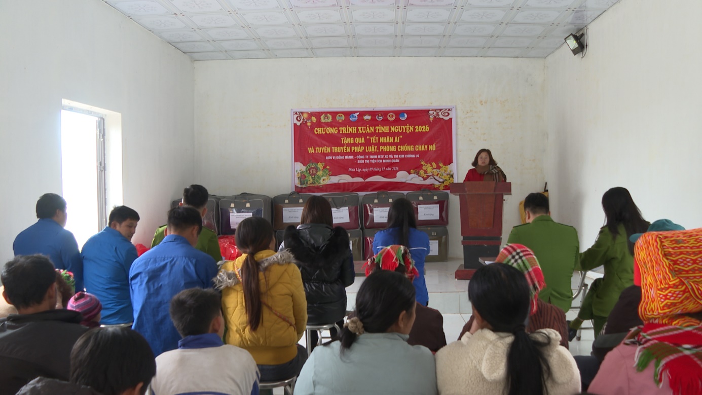 Ngày 09/02/2026, Ủy ban Mặt trận Tổ quốc xã Đình Lập phối hợp với Công an xã, Công ty TNHH MTV Xây dựng và Thương mại Kim Cương và Siêu thị tiện ích Minh Quân tổ chức chương trình “Xuân tình nguyện 2026 – Tặng quà Tết nhân ái và tuyên truyền pháp luật phòng, chống cháy nổ” tại thôn Ngàn Chả, xã Đình Lập.