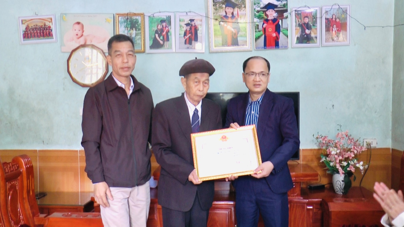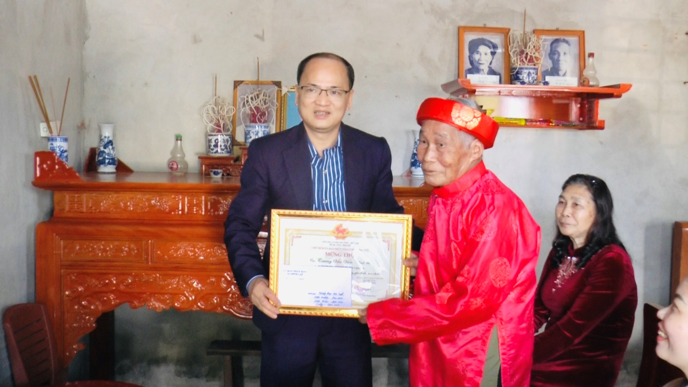 Đ/c Liễu Anh Minh, Bí thư Đảng ủy, Chủ tịch HĐND xã trao giấy mừng thọ và quà cho các cụ 90 tuổi