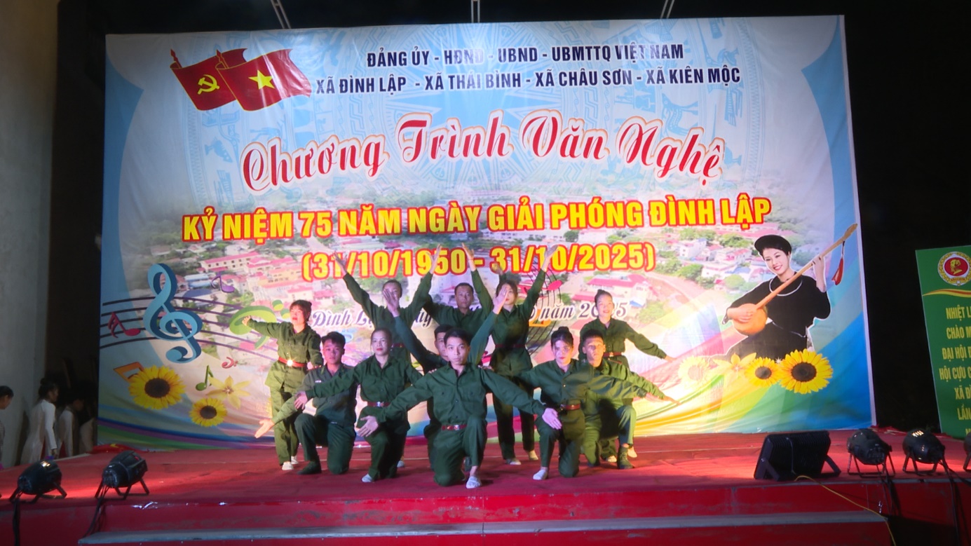 Đặc biệt vào lúc 8 giờ 00 ngày 25/10/2025 đã diễn ra chương trình văn nghệ kỷ niệm 75 năm Ngày Giải phóng Đình Lập (31/10/1950 - 31/10/2025) tại sân khấu Phố Đi bộ Đình Lập. Với hơn 15 tiết mục ca múa nhạc đặc sắc, được dàn dựng công phu bởi các đơn vị, các thôn, câu lạc bộ văn hóa - văn nghệ của các xã Đình Lập, xã Thái Bình, xã Châu Sơn, xã Kiên Mộc đã tạo nên không khí đoàn kết, phấn khởi, tự hào, một dấu ấn đẹp trong chuỗi hoạt động kỷ niệm.