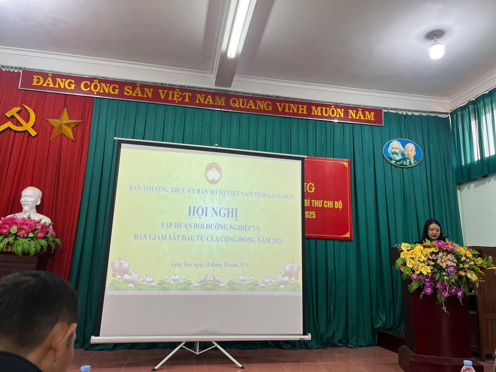 Thực hiện Kế hoạch số 17/KH-MTTQ-BTT, ngày 25/8/2025 của Ban Thường trực Ủy ban MTTQ tỉnh Lạng Sơn về tập huấn, bồi dưỡng nghiệp vụ Ban giám sát đầu tư của cộng đồng năm 2025. Nhằm phổ biến, quán triệt một số nội dung cơ bản của Luật Thực hiện dân chủ ở cơ sở; các văn bản quy phạm pháp luật của Nhà nước, của Ủy ban Trung ương MTTQ Việt Nam liên quan đến công tác giám sát đầu tư của cộng đồng; Hướng dẫn phương pháp, kỹ năng trong hoạt động và giám sát của Ban Giám sát đầu tư của cộng đồng cấp xã; giới thiệu, trao đổi về các phương thức, mô hình hoạt động. Phổ biến một số nội dung cơ bản về công tác giám sát, phản biện xã hội của MTTQ.