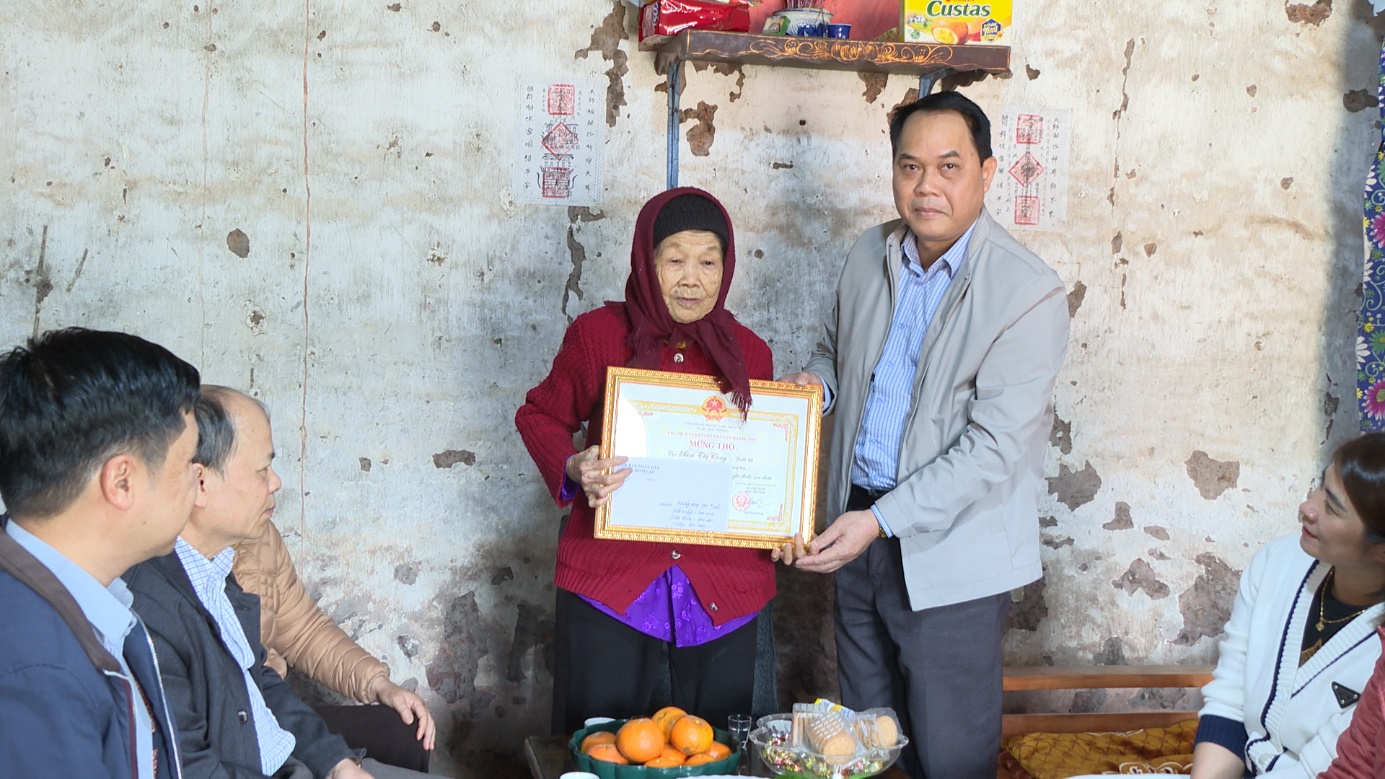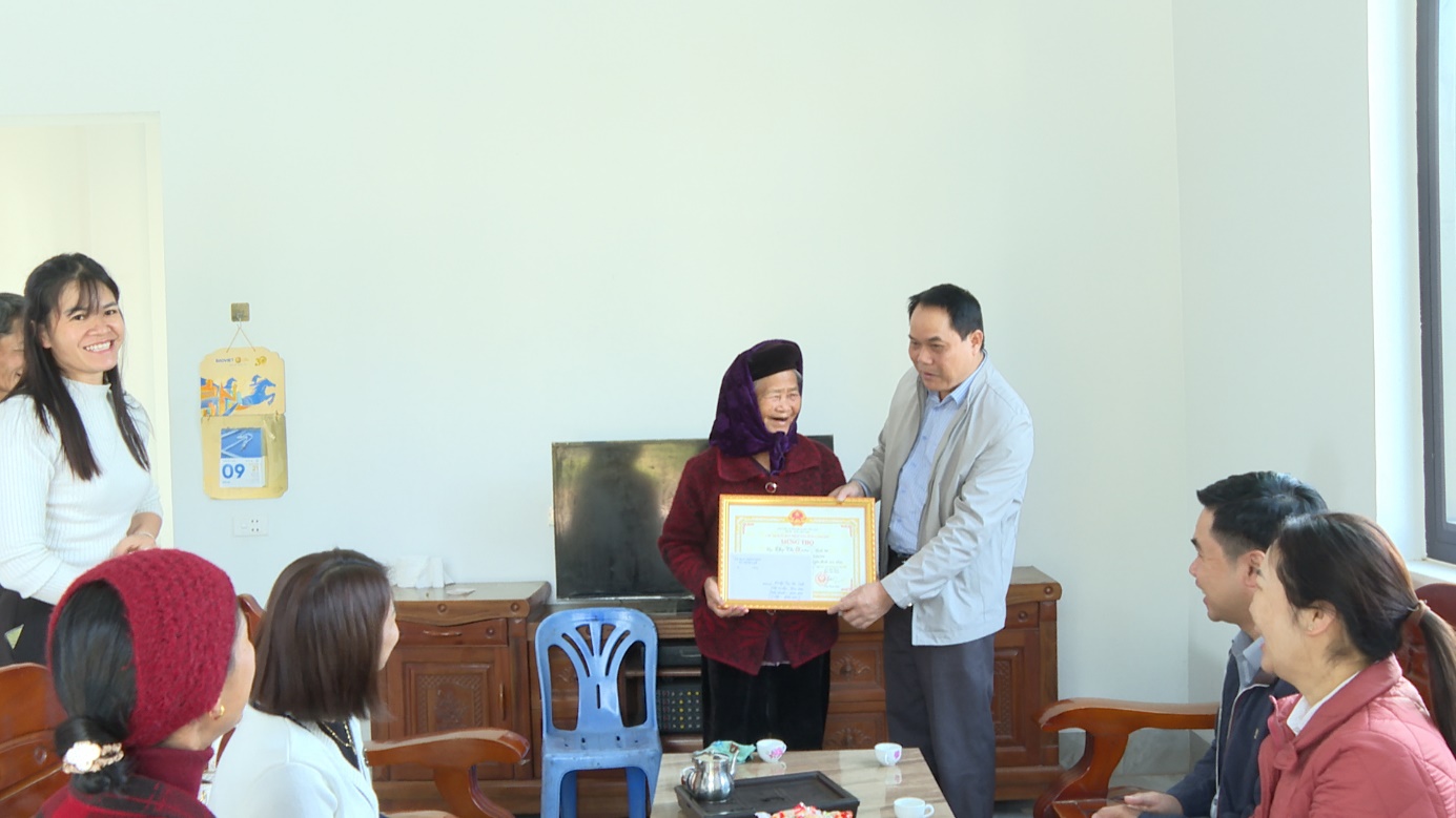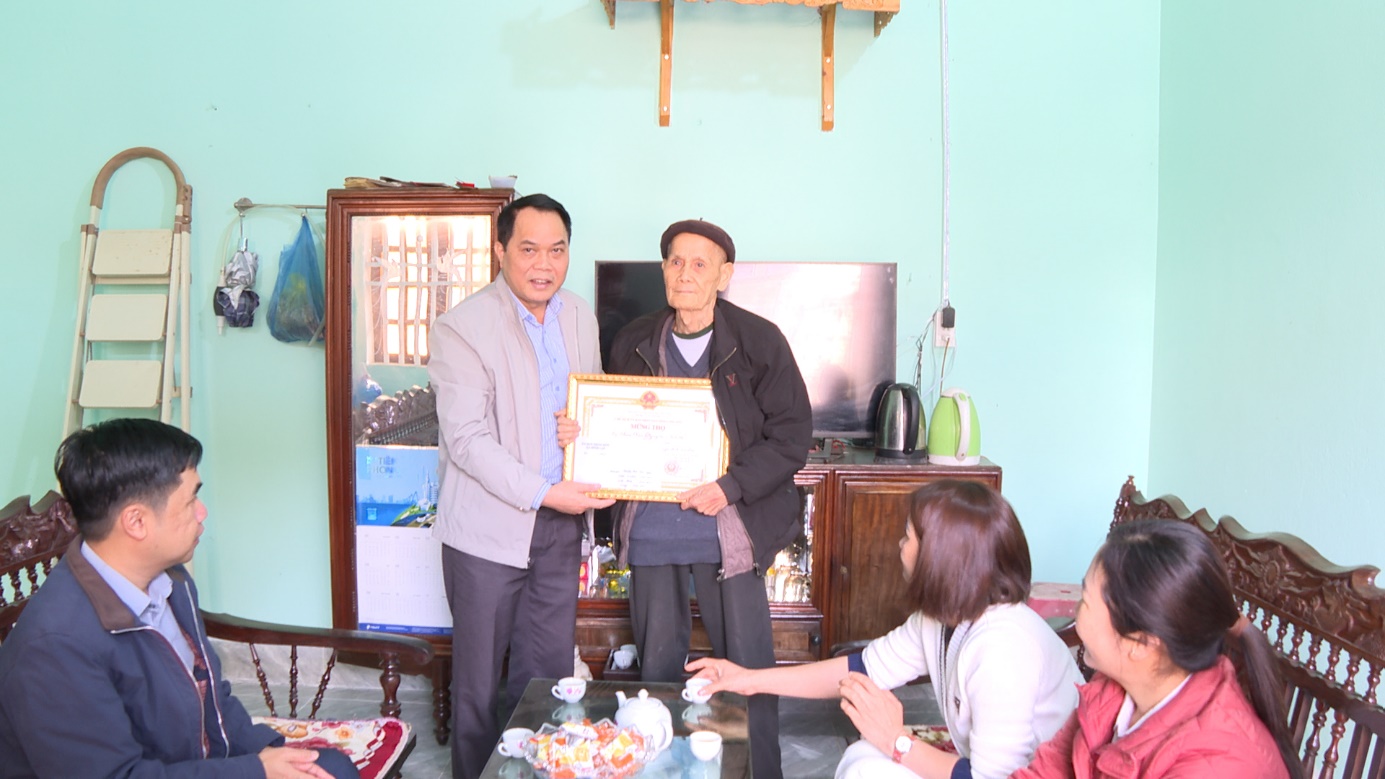 Lãnh đạo HĐND xã trao giấy mừng thọ và quà cho các cụ 90 tuổi