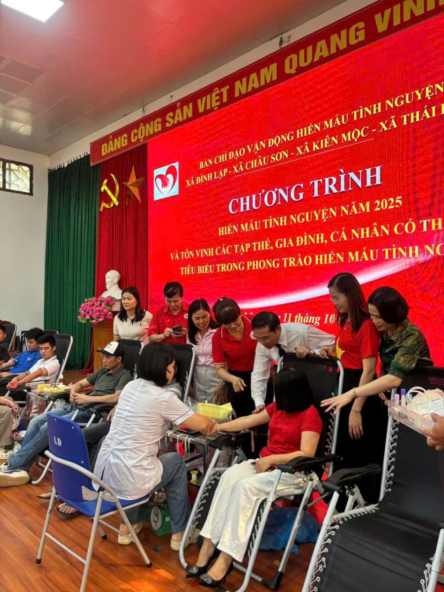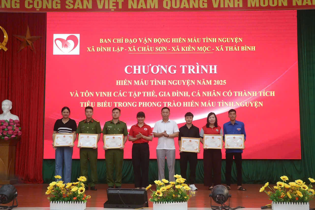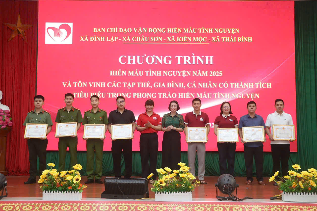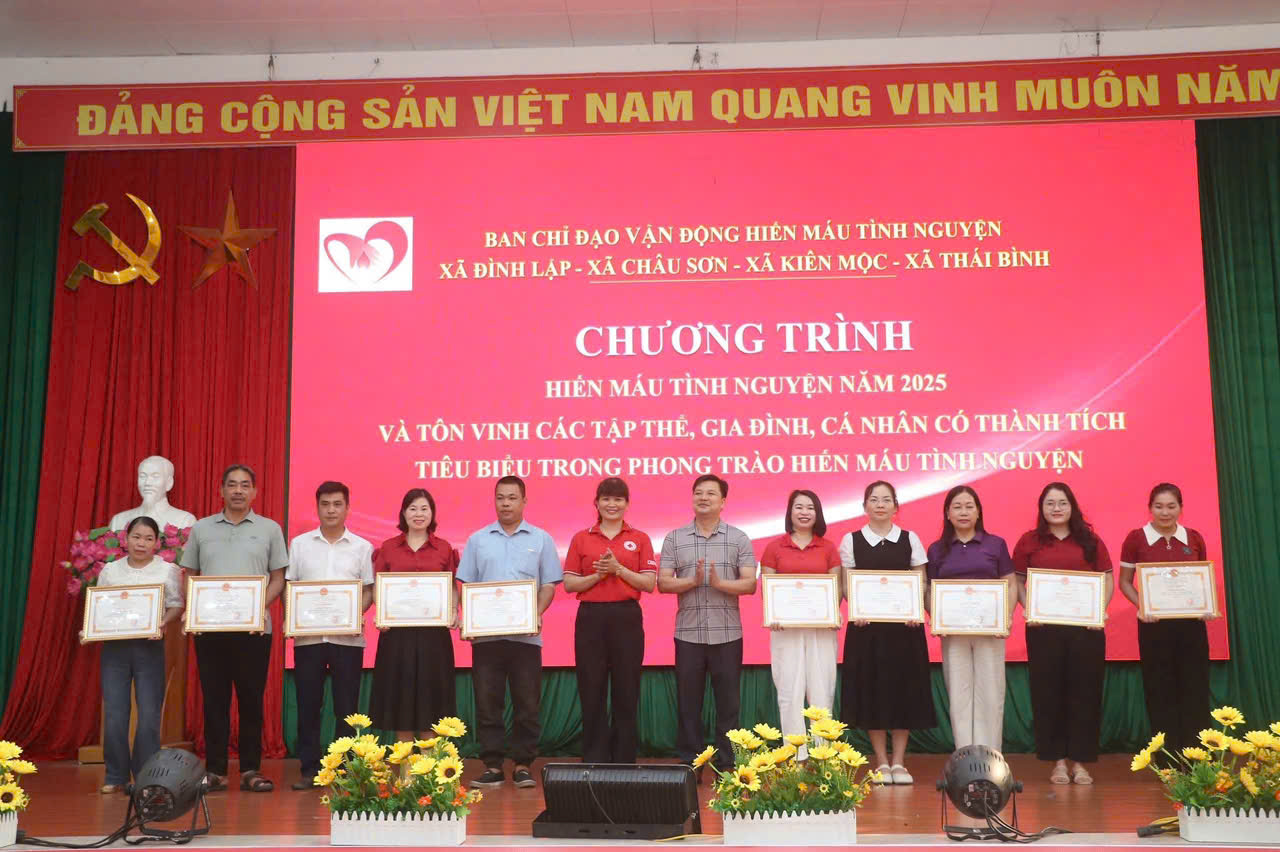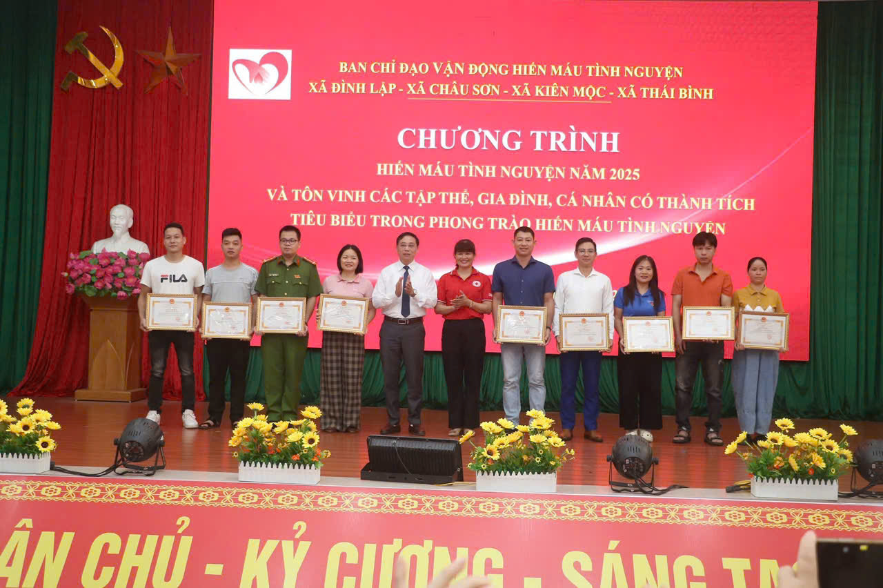 Nhân dịp này, Ban Chỉ đạo Vận động hiến máu tình nguyện các xã: Đình Lập, Châu Sơn, Kiên Mộc và Thái Bình đã tôn vinh nhiều tập thể, gia đình, cá nhân có thành tích tiêu biểu trong phong trào hiến máu tình nguyện; UBND xã Đình Lập phát động ủng hộ Quỹ Hiến máu tình nguyện năm 2025 đạt hơn 9 triệu đồng.