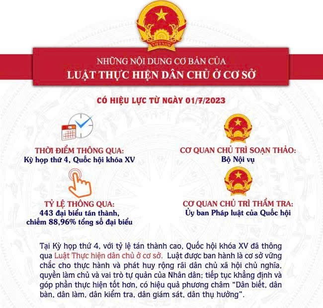 Ngày 10 tháng 11 năm 2022, tại kỳ họp thứ 4, Quốc hội nước Cộng hoà xã hội chủ nghĩa Việt Nam khoá XV đã thông qua Luật Thực hiện dân chủ ở cơ sở, có hiệu lực thi hành từ ngày 01/7/2023.