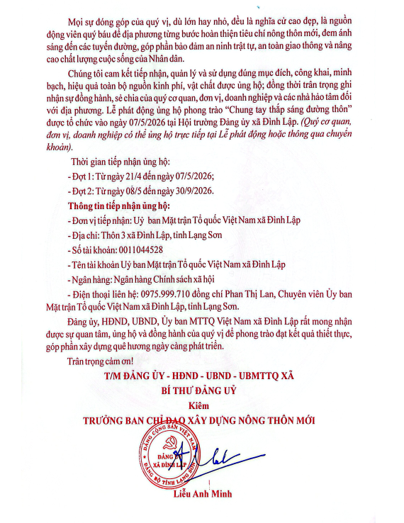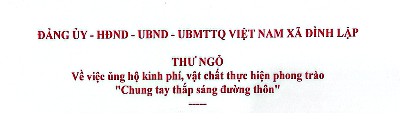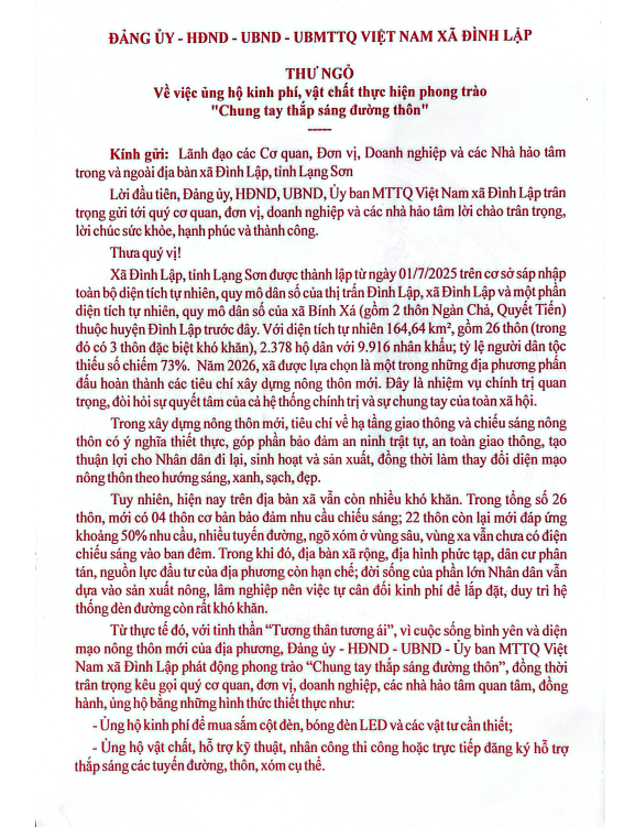 Thư ngỏ về việc ủng hộ kinh phí, vật chất thực hiện phong trào "Chung tay thắp sáng đường thôn"