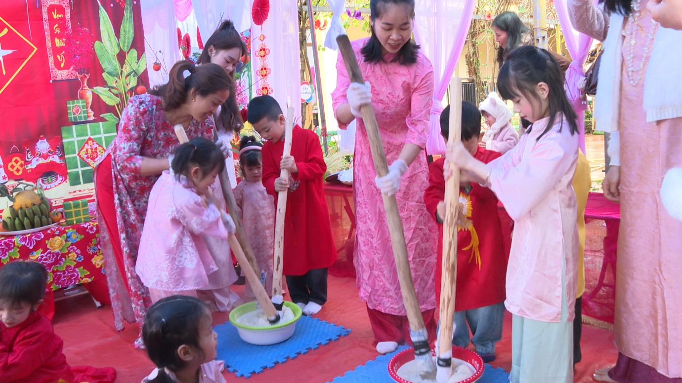 Tại chương trình, các bé đã được tham gia trải nghiệm các hoạt động văn hoá, văn nghệ mang đậm không khí Tết cổ truyền của dân tộc Việt Nam như: gói bánh chưng, giã bánh giầy, nặn bánh trôi, trang trí cành đào, bày mâm ngũ quả, chơi các trò chơi dân gian. Các hoạt động diễn ra sôi nổi, rộn ràng với sự hào hứng thích thú, các bé không chỉ được vui chơi, mà còn hiểu thêm về ý nghĩa của từng phong tục ngày Tết, từ cách làm bánh chưng, bánh giầy tượng trưng cho đất trời, đến mâm ngũ quả thể hiện ước vọng về một năm mới đủ đầy, may mắn. Những trải nghiệm trực quan, sinh động giúp các em thêm hiểu biết và trân trọng những giá trị văn hoá truyền thống, từ đó hình thành tình yêu quê hương, đất nước và ý thức gìn giữ bản sắc văn hoá dân tộc.