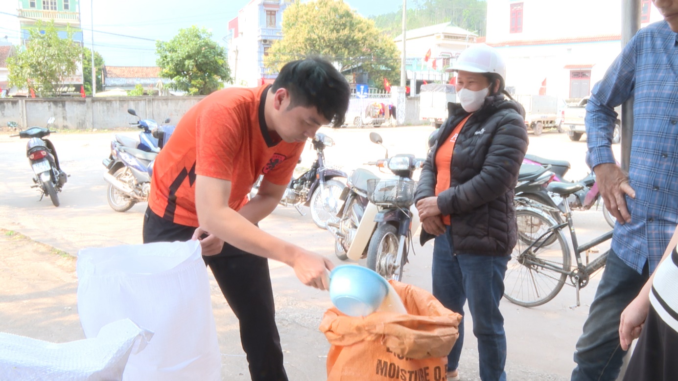 Cán bộ Phòng Văn hoá Xã hội, UBND xã cấp phát gạo cho các hộ dân
