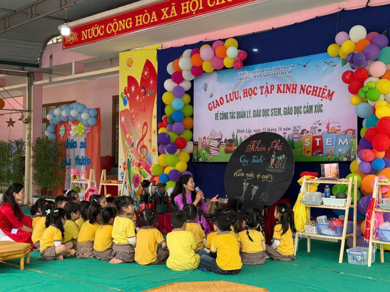 Tại buổi giao lưu, các đại biểu đã được dự giờ hoạt động giáo dục STEAM “Khám phá quy trình làm nước ép quả” cho trẻ lứa tuổi mẫu giáo 5-6 tuổi; STEM “Dạy trẻ kỹ năng biết chờ đến lượt” cho trẻ lứa tuổi mẫu giáo 4-5 tuổi. Và được tham quan thực tế việc xây dựng môi trường lấy trẻ làm trung tâm; giáo dục STEM, quy trình bếp ăn một chiều, cách thức tổ chức các hoạt động nuôi dưỡng, chăm sóc, giáo dục cảm xúc tại nhóm lớp trẻ, công tác bán trú tại trường Mầm non I Đình Lập.